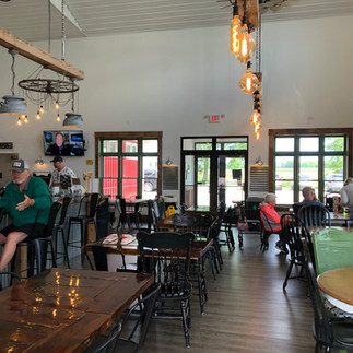 Inside the tasting room, plenty of natural light floods through windows and there are around six dining room tables that allow anywhere from four to six people to grab seats. The light fixtures are made to look like old windmill fans or wooden tillers which are my favorite fixtures that we’ve come across. To the right the space is taken up by a bar where you order your food and drinks (no seating at the bar). There’s a small shelf dedicated to swag right outside the entrances to the bathrooms and from that alcove you can catch glimpses of the production floor. The tables are all a little different, since they wanted to stick with the farmhouse feel, it can give a little bit of a cobbled together vibe but it’s hardly noticeable.